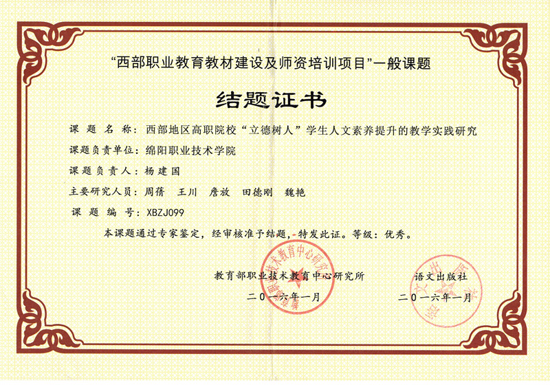 3月17日,接教育部职业技术教育研究中心通知,公司杨建国教授主持的省部级课题《西部地区高职院校“立德树人”员工人文素养提升的教学实践研究》(课题编号:XBZJ099)得到相关专家的一致好评,顺利通过验收,课题评价等级为:优秀。课题组成员有杨建国、周蒨、王川、詹放、田德刚和魏艳五位教师。