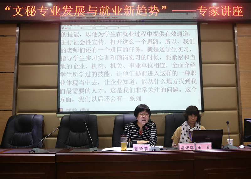 张玲莉老师首先从宏观上分析了文秘专业就业的新趋势,并以一线城市北京为例,从经济转型、新兴行业需求、秘书综合技能等方面,提出了市场对高级秘书的需求。随后,张老师还结合实际,跟大家一起探讨了新职业与角色变化对文秘专业提出的巨大挑战,当中所提到的速录秘书、媒体资源编目员、医疗行政助理等都是文秘就业方向的新热点。最后,针对文秘专业的核心课程重构,新技术在课程当中的融入问题,张玲莉老师也做了详细的阐述和分析,并结合四川高职院校文秘专业的发展现状,提出了许多建设性的建议和看法。