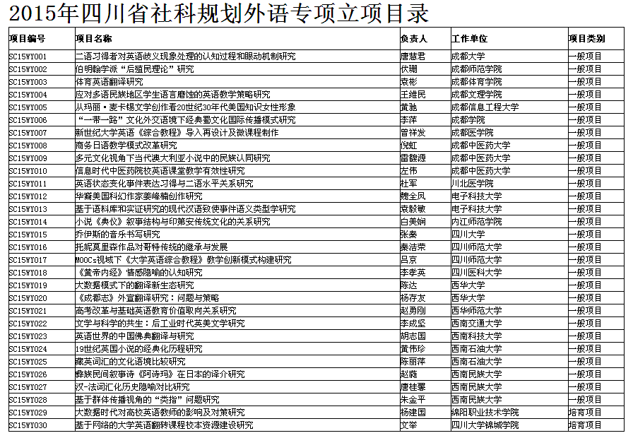 近日,经四川省社会科学规划办公室与上海外语教育出版社联合组织专家评审,2015年四川省社科规划“外国语言文学团队建设和发展”专项课题现已立项。总共30项,公司杨建国教授负责的《大数据时代对高校英语教师的影响及对策研究》(项目编号SC15WY029)获得立项。