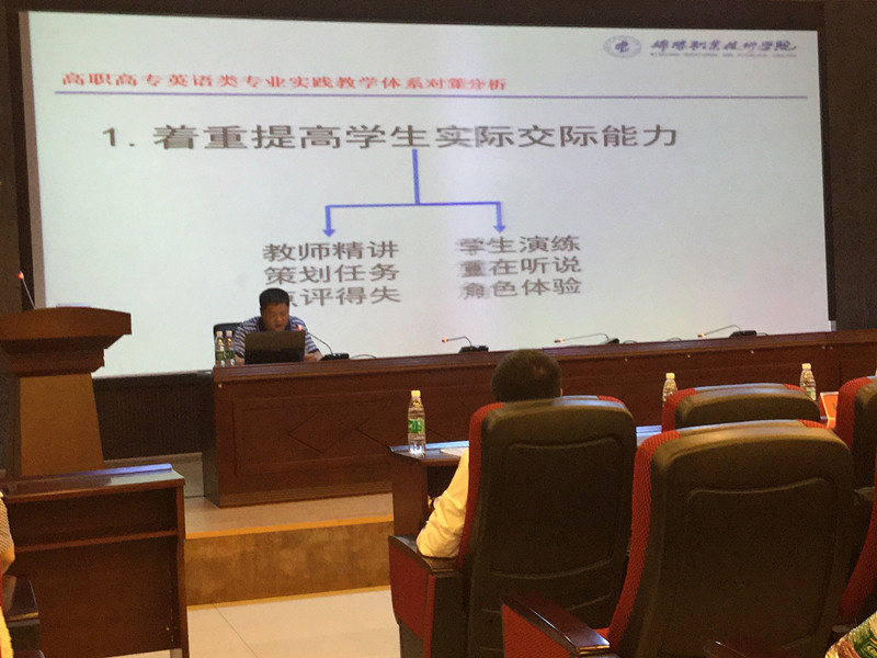 在发言中,杨建国教授阐释了“高职高专英语类专业实践教学体系建立的原则”,并对高职高专英语类专业实践教学体系的建立进行了对策分析。他指出:高职高专英语类专业实践教学体系的建立应遵循1培养模式遵循用人单位参与整个教学过程的原则;2课程设置遵循理论是基础,突出实践教学的原则;3教学设计遵循职业岗位的需求、以培养员工的综合职业能力为宗旨的原则;4培养途径遵循工学结合的原则。在介绍公司英语专业实践教学改革经验时,他讲到:高职高专的教学原则应当是“教师精讲,策划任务,点评得失;员工演练,重在听说,角色体验”, 要求教师依照规划的教学内容,给员工布置任务,引导所有的员工通过完成任务的方式积极参与到课堂教学中的听、说、读、写、译的实践活动中,以开展“课堂讨论、课堂演示、案例分析、模拟演练”等教学活动为主,以工作过程为导向,任务驱动,让员工在执行任务的过程中应用语言知识,发展交际能力,培养其发现问题、分析问题、解决问题的能力及团队合作意识。提高员工的实际操作能力和综合职业素养。