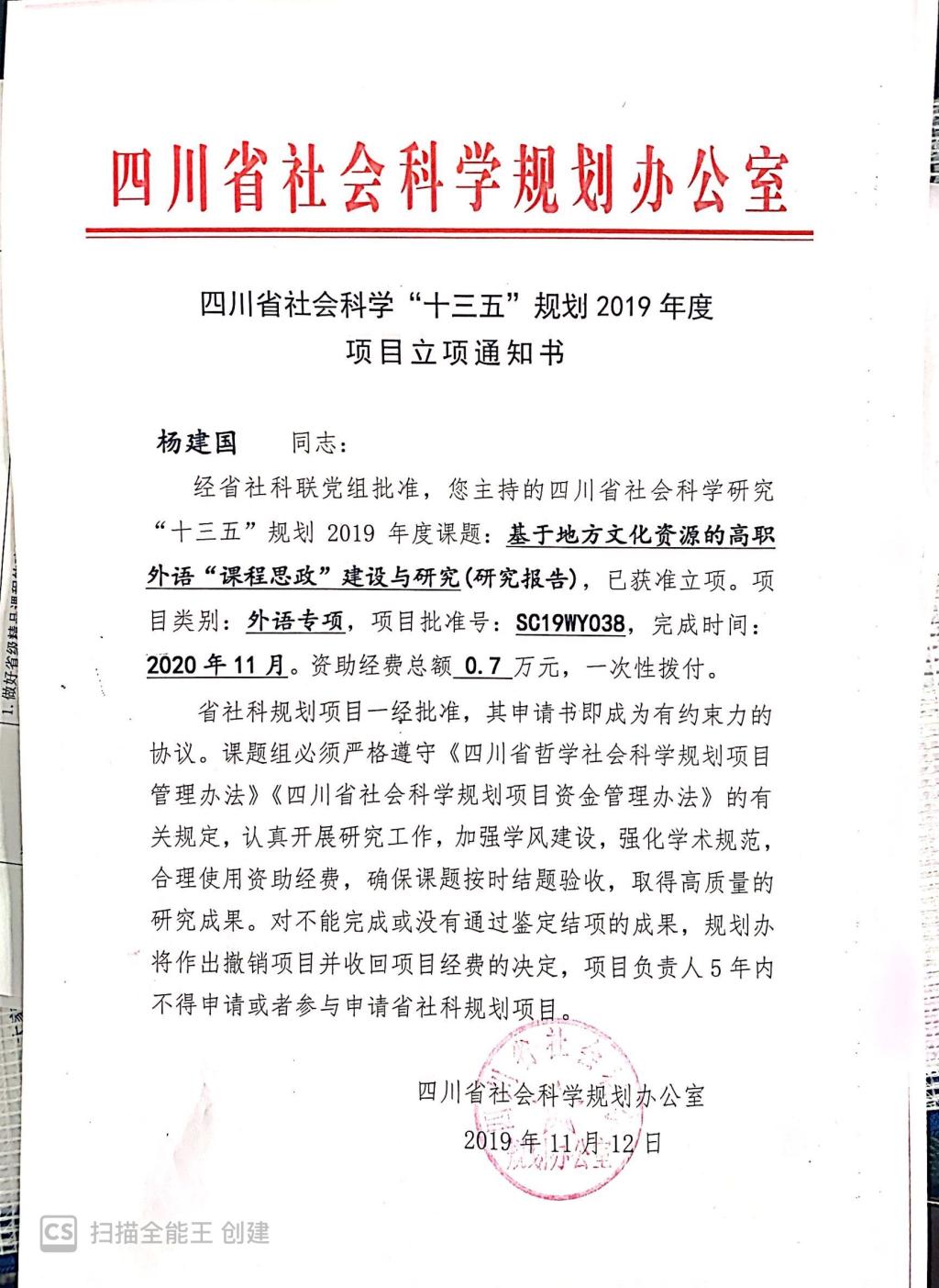 由公司党委常委、副董事长杨建国带领公司教师陈昌学、陶然、蔡姿先、吴怡洁申报的四川省社会科学规划专项项目“基于地方文化资源的高职外语课程思政建设与研究”近日获准立项并开始建设。