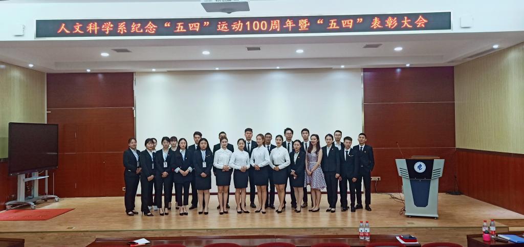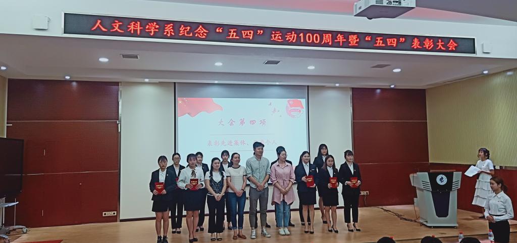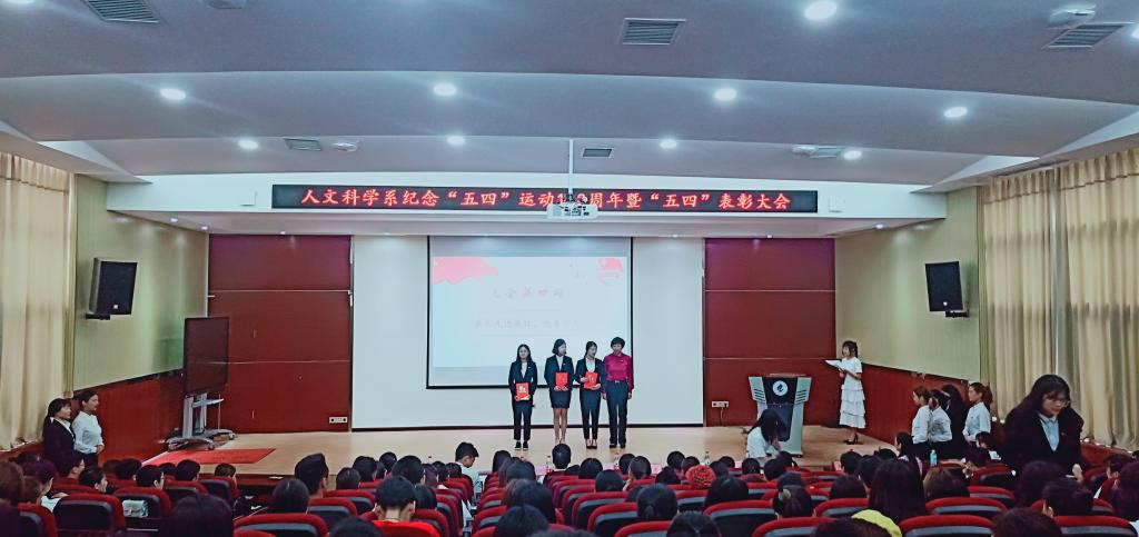 4月25日中午,人文科学系举办的纪念五四运动100周年暨五四表彰大会在公司智慧教室举行。校团委副书记喻沛杰,系党总支副书记林涛,系团总支书记谢婷婷、员工干事及全体辅导员老师、团学干部和青年员工代表200余人出席了此次表彰大会。