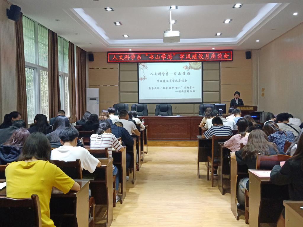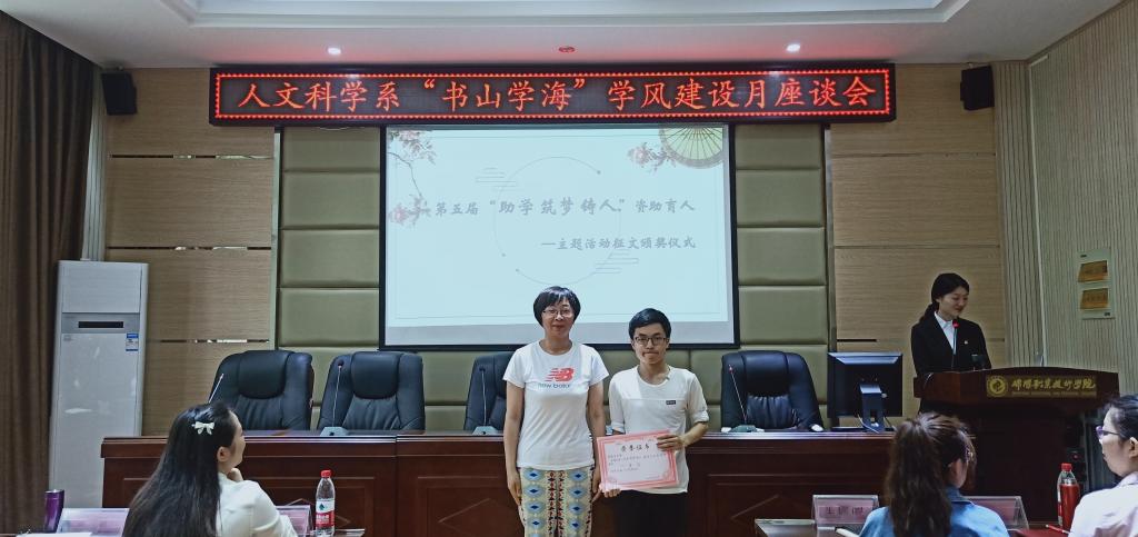 6月11日中午,人文科学系在实验楼一楼会议室召开了“书山学海”学风建设月座谈会暨第五届“助学 筑梦 铸人”资助育人系列比赛颁奖活动。系党总支副书记林涛、团总支书记谢婷婷、员工干事蒋艺、田琳老师、闫涵玉老师及各班班干部代表和员工代表出席本次活动。