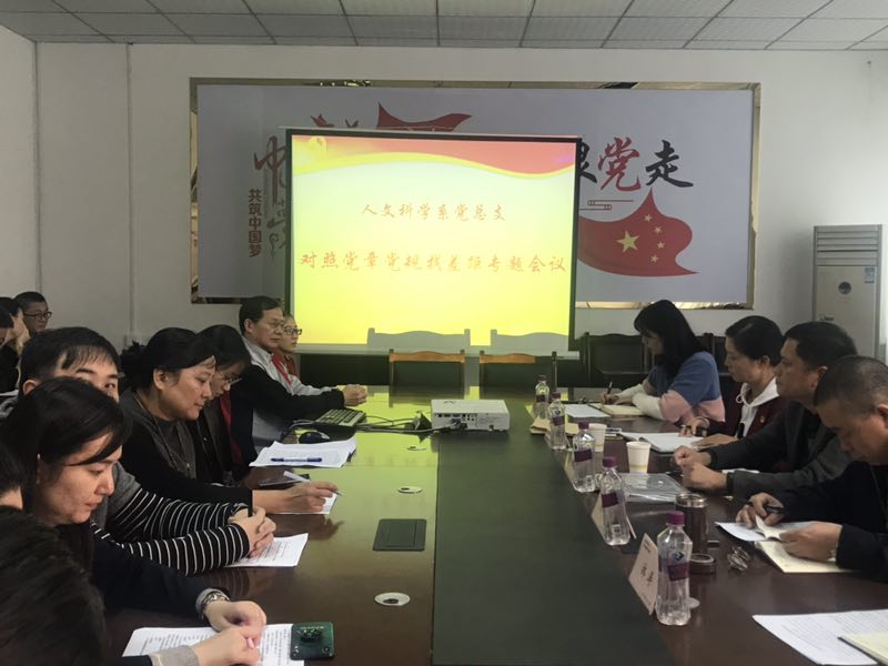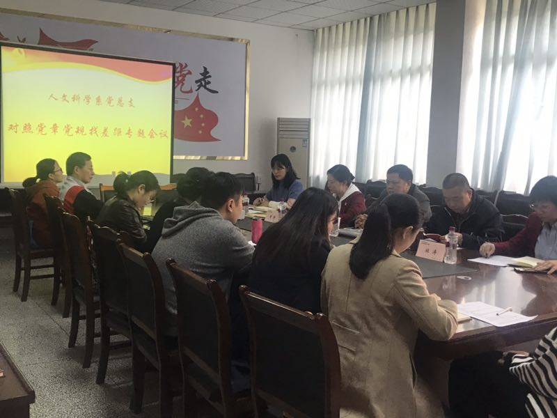 20191029下午1:00,人文科学系党总支在实验楼306会议室召开了对照党章党规找差距专题会议,人文科学系全体党员参加会议,人文科学系联系校领导、公司党委常委、副董事长杨建国,公司“不忘初心、牢记使命” 主题教育指导检查组组长黄静到会指导,人文科学系党总支书记、主任杨富主持会议。