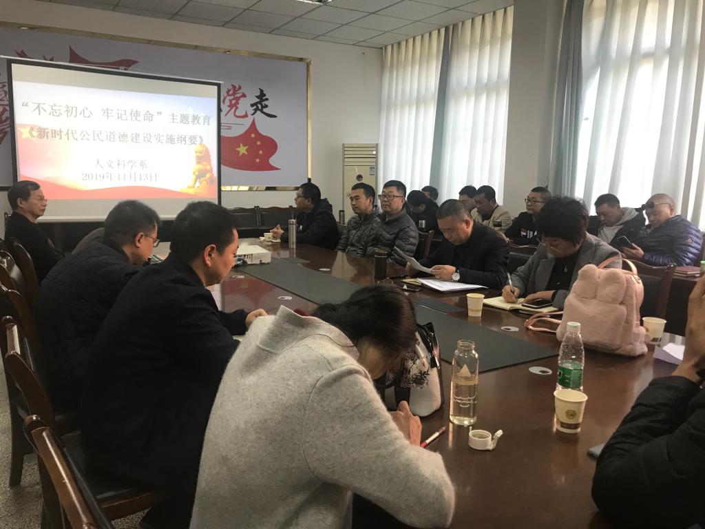 2019年11月13日下午5:30,人文科学系党总支在实验楼306会议室开展了“不忘初心、牢记使命”主题教育,学习《新时代公民道德建设实施纲要》。人文科学系全体教职工参加会议,人文科学系党总支书记、系主任杨富主持会议。