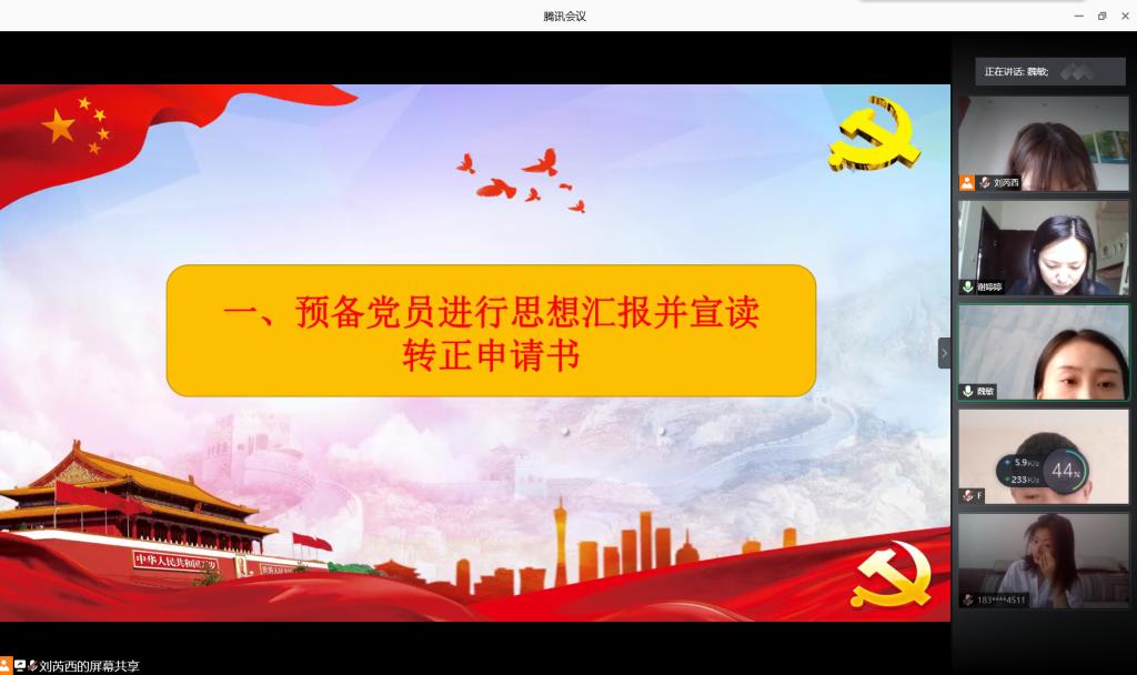 6月15日上午,人文科学系员工党支部召开吸收正式党员会议,讨论吸收潘学、魏敏等4名中共预备党员为中共正式党员的事宜。受疫情影响,本次会议采用网络在线形式。参加本次会议的有员工党支部书记谢婷婷,党支部副书记闫涵玉以及支部全体党员同志,并特邀党员教师陈玥君出席会议。本次会议由谢婷婷同志主持。