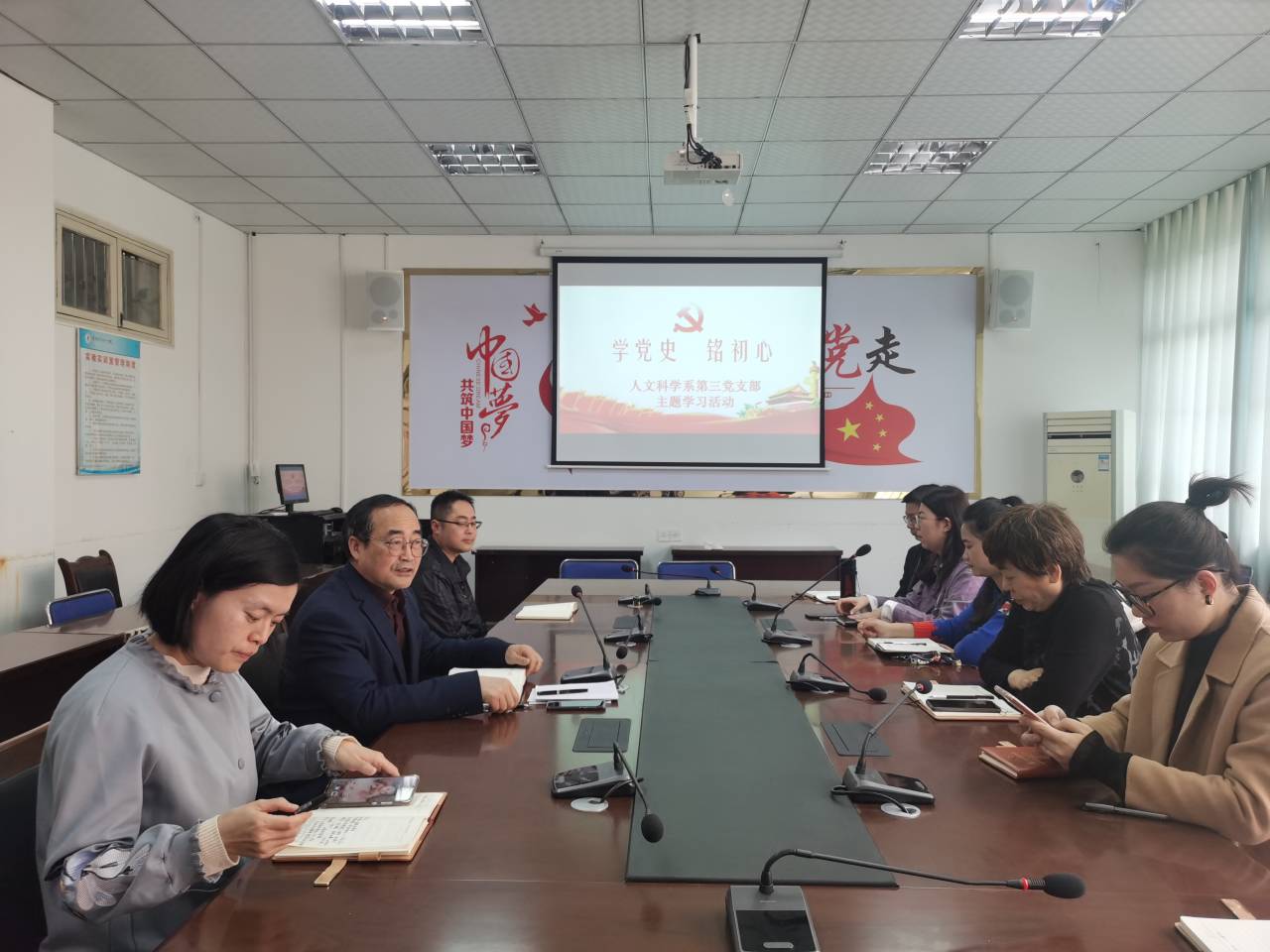 4月7日,人文科学系第三党支部全体党员教师在实验楼306教室开展了“学党史 铭初心 迎华诞”的主题党日学习教育活动,会议由第三党支部书记勾淼老师主持,系总支书记晏永明到会指导。