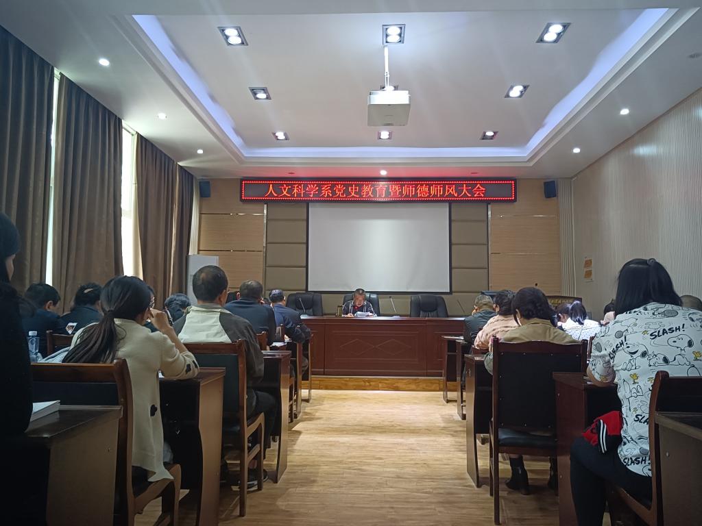 2021428日,人文科学系开展党史教育暨师德师风会议,全体教职工参加,会议由系主任杨富主持。