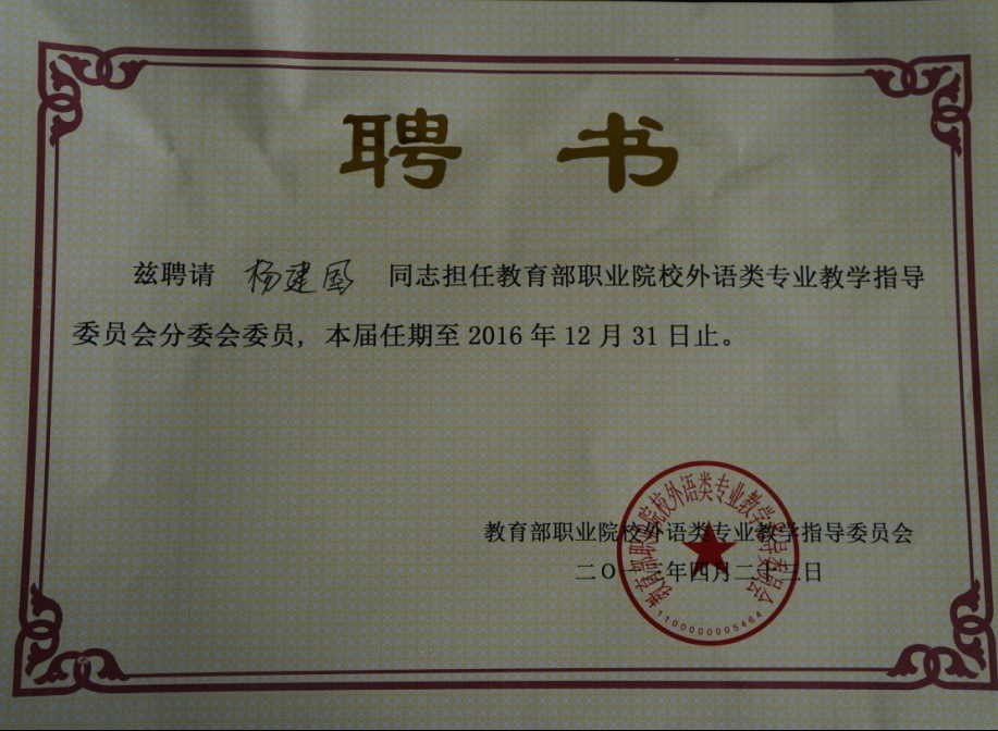 公司杨建国教授被聘为教育部职业院校外语教指委分委会委员