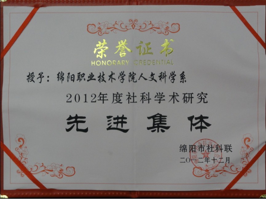 2012年,我系组织了丰富多彩的社科学术研究活动,被绵阳市社科联授予“社科学术研究先进集体”。
