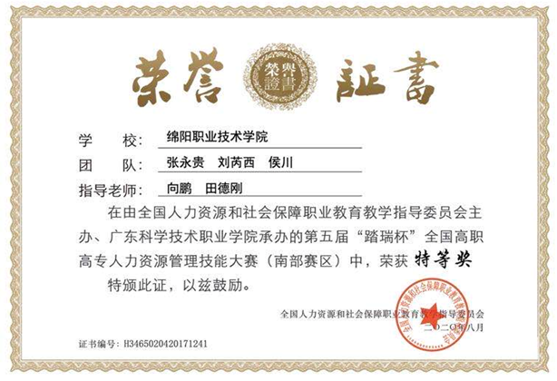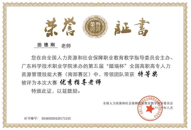 2020年7月31日至8月2日,由全国人力资源和社会保障职业公司产品指导委员会主办,广东科学技术职业公司承办的第五届“踏瑞杯”全国高职高专人力资源管理技能大赛(南部赛区)首次以网络赛的形式举行。此次比赛受新冠疫情影响,采取了线上的网络赛模式,面对全新的比赛模式,公司师生团队沉着应战,在开局劣势的情况下完成最后的翻盘,并最终斩获本次大赛的特等奖,顺利挺进全国总决赛。我系教师向鹏、田德刚老师被评为本次大赛的优秀指导教师。