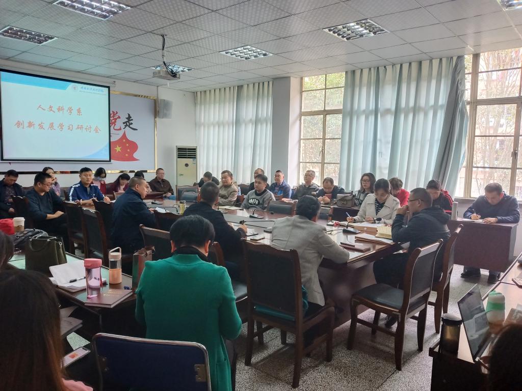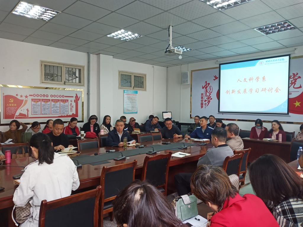 2020年10月14日下午在实验楼三楼会议室,人文科学系召开创新发展学习研讨会,全体教职工参会,会议由系党总支书记、系主任杨富主持。