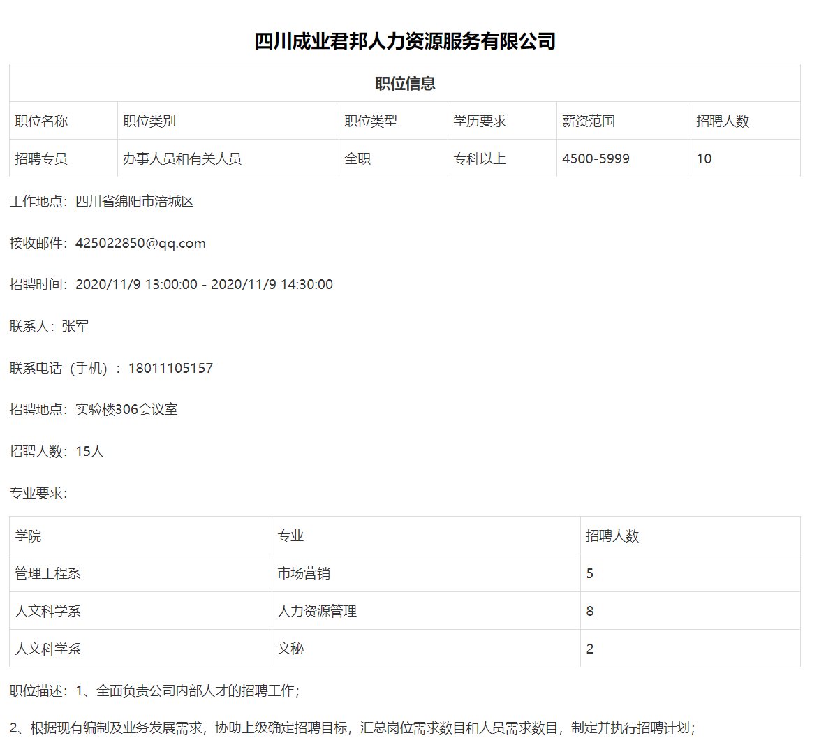 2020年11月9日下午14:30,人文科学系在实验楼306为成业君邦人力资源有限公司开展专场招聘会。成业君邦招聘团队、人文系相关教师及人力资源专业应届毕业生参加本次招聘。