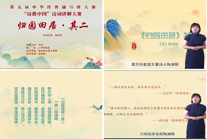 6月21日,“诗教中国”诗词讲解大赛校赛决赛以视频展播方式在人文大楼举办,专业评委对参赛视频作品现场评分,根据成绩确定入围省赛的作品。其中由威廉williamhill体育大学语文教研室主任宋丽娟指导邓钦老师的作品《归园田居·其二》成功入围省赛。